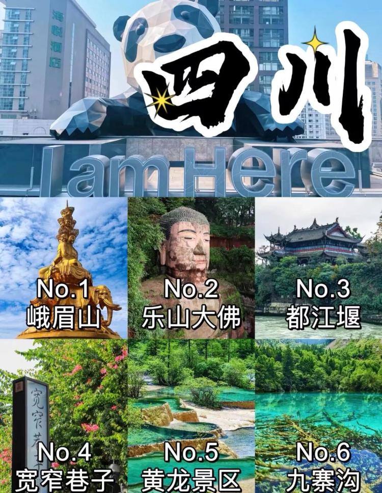 四川必去景点:春熙路、成都、九寨沟、亚丁稻城、黄龙风景区、乐山大佛、峨眉山、都江堰、熊猫基地等